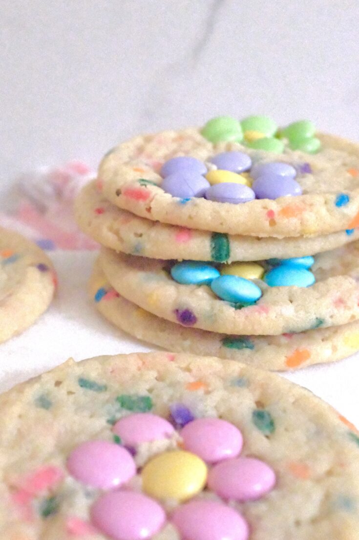 These Pretty M&M Flower Cookies are soft, chewy, and decorated with colorful M&M flowers!