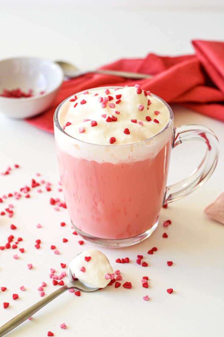 It’s made with melted white chocolate, steamed milk, and just a few drops of red food coloring for that soft pink color.