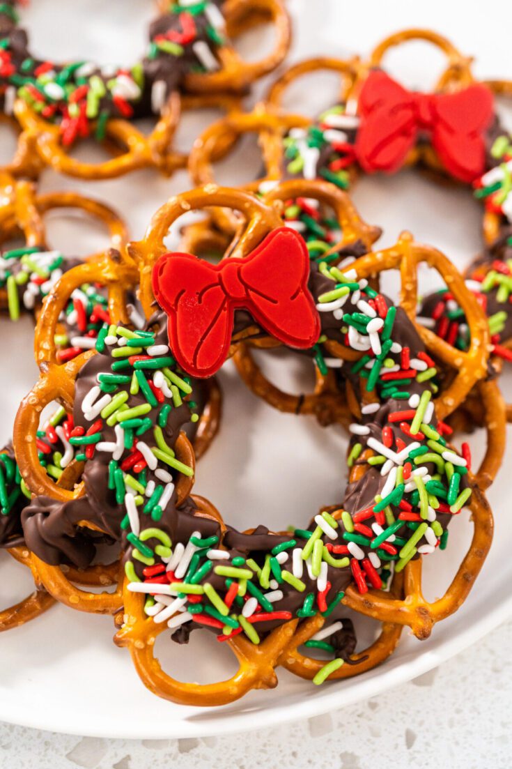 - Add another drizzle of chocolate on top of the second layer of pretzels. Quickly sprinkle with Christmas sprinkles and add the bow sprinkle if using. Repeat with the remaining wreaths